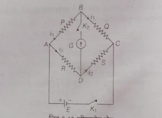 #:- रचना :- इसमें चार प्रतिरोध P , Q , R और S चित्र अनुसार लगे रहते है और इन्हें बैटरी से जोडकर परिपथ में धारामापी G चित्र अनुइसर लगाया जाता है 1 इन प्रतिरोधो में तीन प्रतोरोध का मान ज्ञात होता है जबकि चोथे s का गीता करना होता है