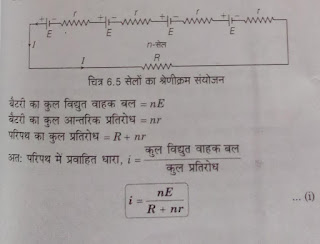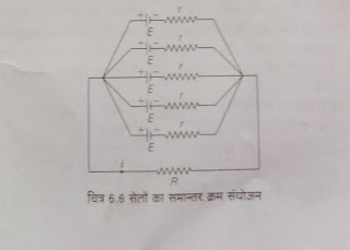 माना n सेल जिनका आंतरिक प्रतिरोध r और विद्युत वाहक बल E को श्रेणी में लगाकर m पंक्तिया समांतर क्रम में चित्रानुसार लगाई गयी है तब –