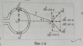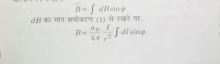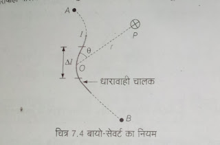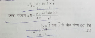 - #:-परिमित लंबाई के रिजुरेखिय धारावाही चालक के कारण उत्पन्न चुंबकीय क्षेत्र:-माना AB एक सीधा धारावाहि चालक तार है जिसमें I धारा बह रही है इसके कारण R दूरी पर स्थित बिंदु p पर चुंबकीय क्षेत्र ज्ञात करना है तब चित्रानुसार बायो सेवृत के नियम अनुसार dl अल्पांश दूरी के कारण चुंबकीय क्षेत्र –
