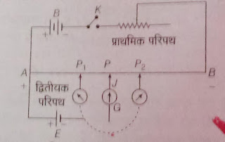 - विभव मापी के द्वारा सेल का आंतरिक प्रतिरोध ज्ञात करने लिए सेल को चित्रानुसार विभव मापी में जोड़ा जाता है –