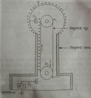 #:- संरचना :- इस मसीन में एक विशाल धातु का खोखला गोला S होता है जो चित्र अनुसार दो वैदुत रोधी सत्म्भो पर रखा होता है और इसमें दो पुली लगी रहती जिनपर एक पट्टा लगा रहता है जो आवेश को एक सिरे से दुसरे सिरे तक ले जाने का कार्य करता है पुली (1 ) के पास में एक कंघी लगी रहती है जो आवेश को H . T श्रोत से को लेकर पट्टे पर डालती है और ये पट्टा इस आवेश को दूसरी पुली तक ले जाने का कार्य करता है