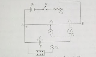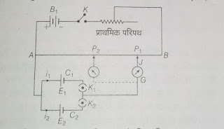 - विभव मापी के द्वारा सेलो के विद्युत वाहक बलों की तुलना करने के लिए सेलो को चित्रानुसार विभव मापी में जोड़ा जाता है –