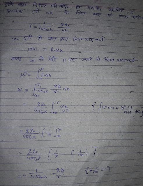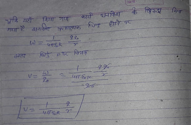 #3:- विद्युत विभव :- किसी एक धन आवेश (परिक्षण आवेश ) को विद्युत क्षेत्र में अनंत से किसी बिंदु तक लाने में विद्युत क्षेत्र के विरुद्ध किया गया कार्य विद्युत विभव कहलाता है इसे भी V से प्रदर्शित करते है अर्थात –