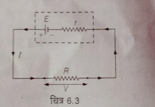 #:- सेल के टर्मिनल विभवान्तर , विद्युत वाहक बल और आंतरिक प्रतिरोध में सम्बन्ध :- माना एक सेल जिसका विद्युत वाहक बल E आयर आंतरिक प्रतिरोध r है बाह्य परिपथ में R प्रतिरोध के उपकरण से जुड़ा है तब –